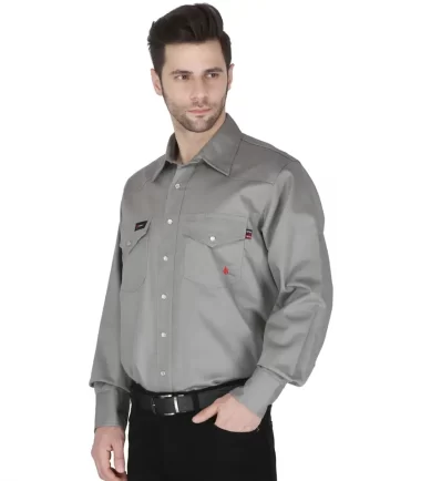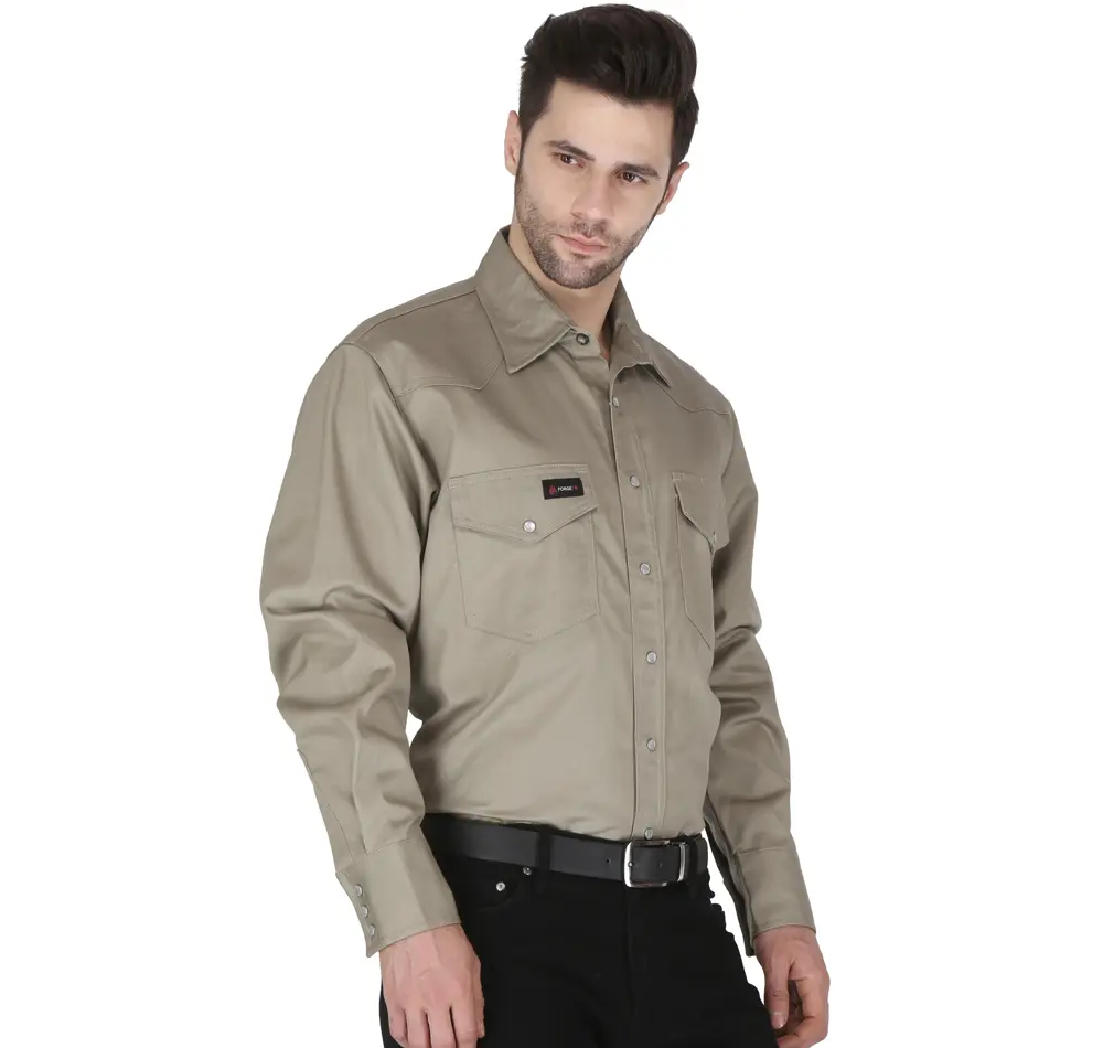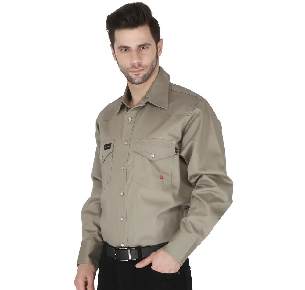 Safe hard  wearing fire resistant shirt. White Pearl Snaps on pocket, placket and cuff closure